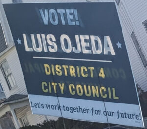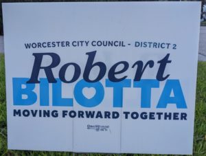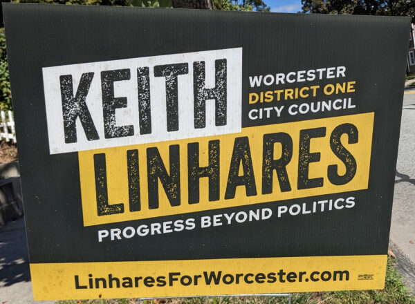 This sign is just great, with distressed type that’s nothing like anything on any other sign, but somehow avoids feeling edgy. Black + white + yellow is a classic color scheme that ignores the whole red vs. blue thing. The word “progress” makes it clear which side of the progressive vs. non-progressive divide he falls on, while “beyond politics” says, “Yes, like you I find the spectacle of the Worcester City Council incredibly annoying.” Great job District 1 for having such great symbolism in your signs, one saying “here’s your Councilor from back in the day using his sign from back in the day,” the other saying “here’s a new guy, with a fresh sign that makes some polarizing (for a Worcester election) choices.”