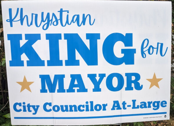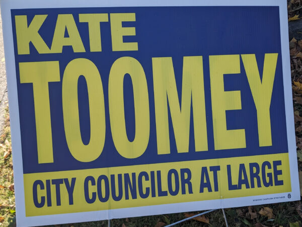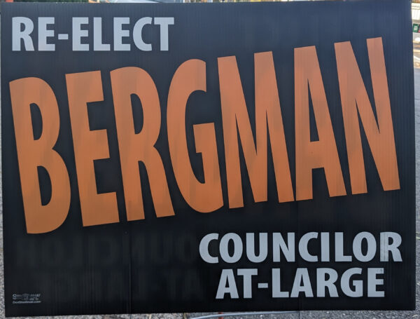 This is pretty much the same sign he used when successfully running for Council a decade ago, updated with the slogan “The Voice of Reason,” the first sign that makes explicit the framing many candidates are using this election—are you a flaky progressive who doesn’t understand the responsibilities and limits of being a City Councilor (i.e., ignoring “reason”), or are you an old stick-in-the-mud stubbornly refusing every opportunity to make people’s lives better, and who 50 years from now will have obviously been on the wrong side of history?