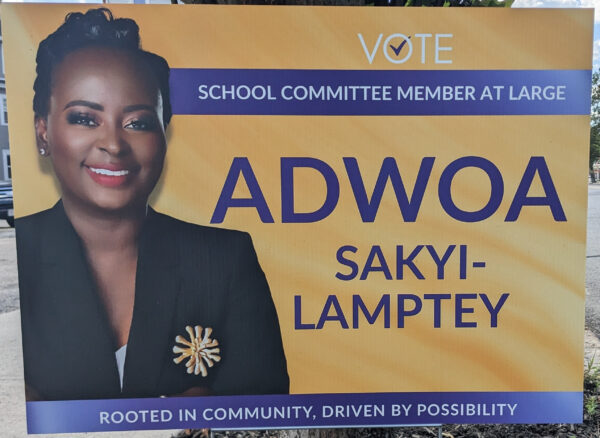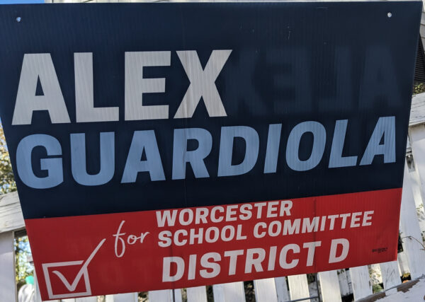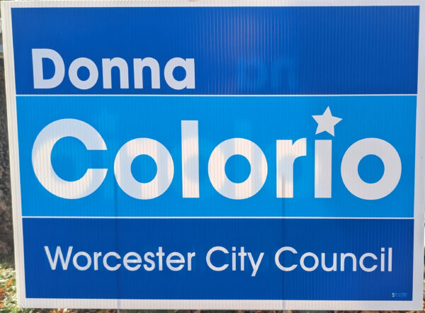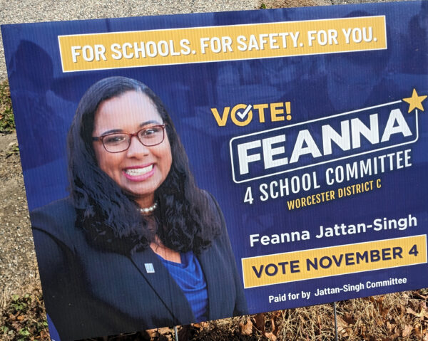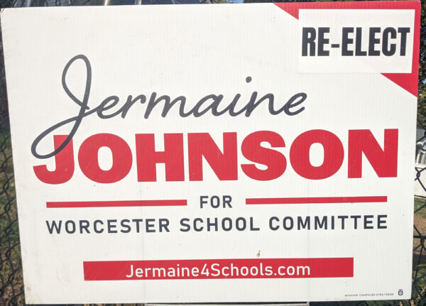 Our third uncontested School Committee race. More of that clean, contemporary graphic design. The red part at the bottom is a visual surprise, especially as the margin above Worcester is so tiny. The rare sign that feels really organized, like “This part is the candidate name, this part is everything else.”