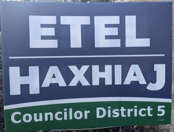 I empathize with anyone with an unwieldy last name. We should all be so lucky as Etel to have a distinctive and wieldy first name, the sign doesn’t shy away from “Haxhiaj” but it knows the “ETEL” is what you’re going to recognize. A green field and blue sky, either a symbol of progressivism, farming, or living on the planet earth. Not bad colors in any case.