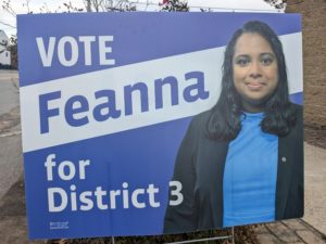 Let’s compare this with her 2023 Council sign (below). We again have a photo of her, in a pretty similar outfit, and again have the focus on “Vote Feanna.” But whereas I called her previous sign “Admirably restrained,” this one is admirably unrestrained. Now she has glasses, the photo is implied to be a selfie, her first name is on the sign twice, her last name is on the sign twice, she has a slogan, there’s a faint photo behind her photo, we are reminded to vote twice, she uses “4” for “for” and is not even in District 4, there’s a border around her name and that decoration is itself decorated with a star. I don’t need to go on, writing about this sign is like dancing about architecture.