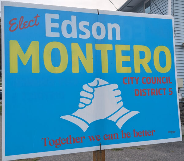 This is the only Montero sign I’ve seen this year, a leftover from his run for District Councilor last election. This color scheme, that drawing of hands, and the lack of a period at the end of the slogan, that’s three things about this sign that throw me. Which isn’t necessarily a bad thing, and if you’re going to throw me, you might as well go whole hog.