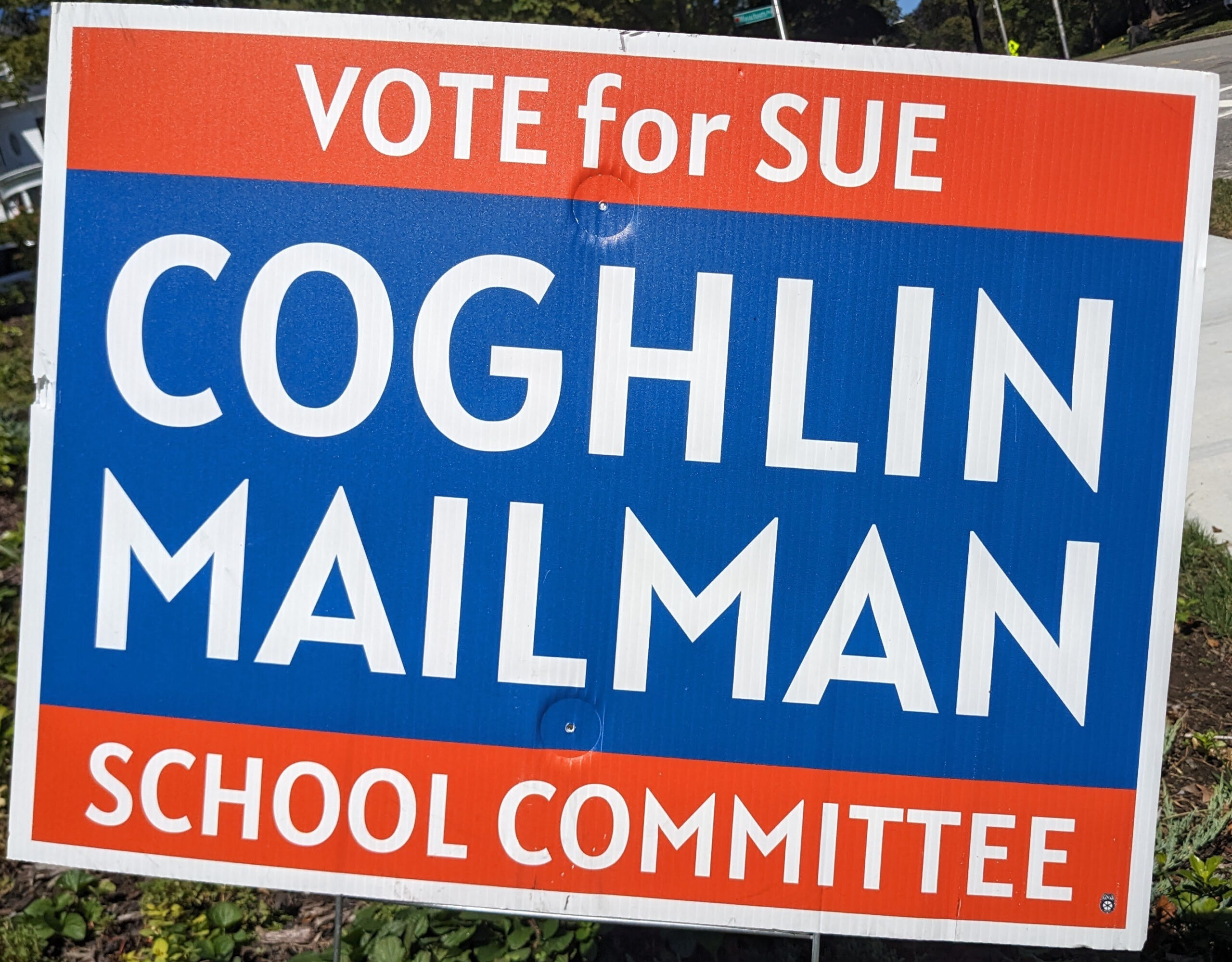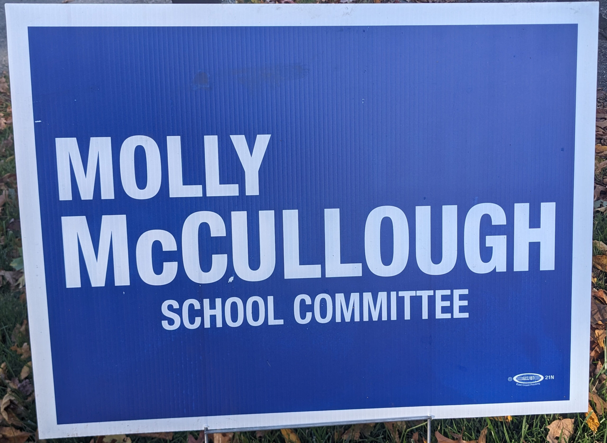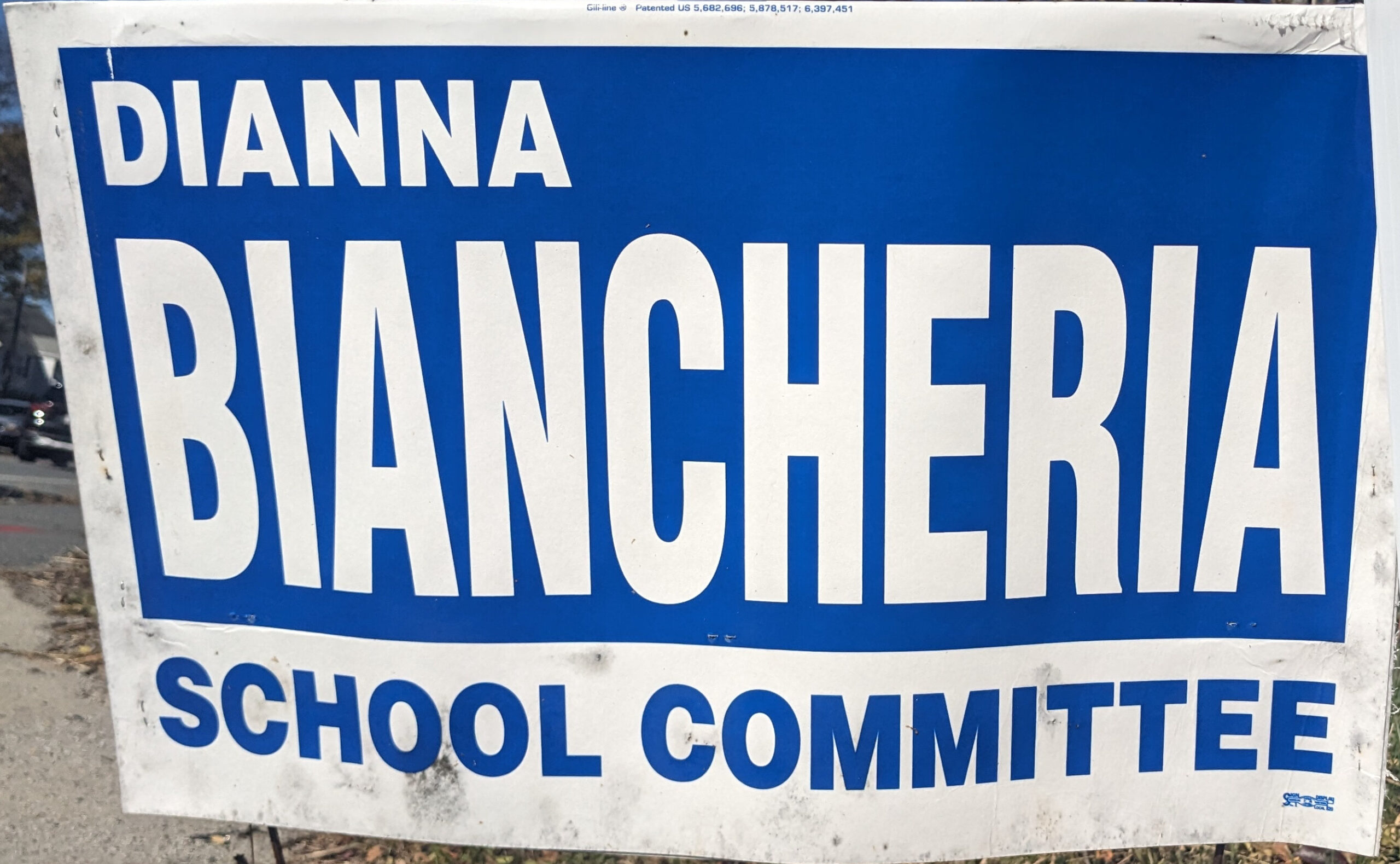 Our fourth and final uncontested School Committee race. The same first-name-in-script idea as King’s sign, but this sign does a better job of it. This candidate is running unopposed and only has a few signs out there, but great job repurposing the old ones by covering “Vote November 2” with a “RE-ELECT” sticker.