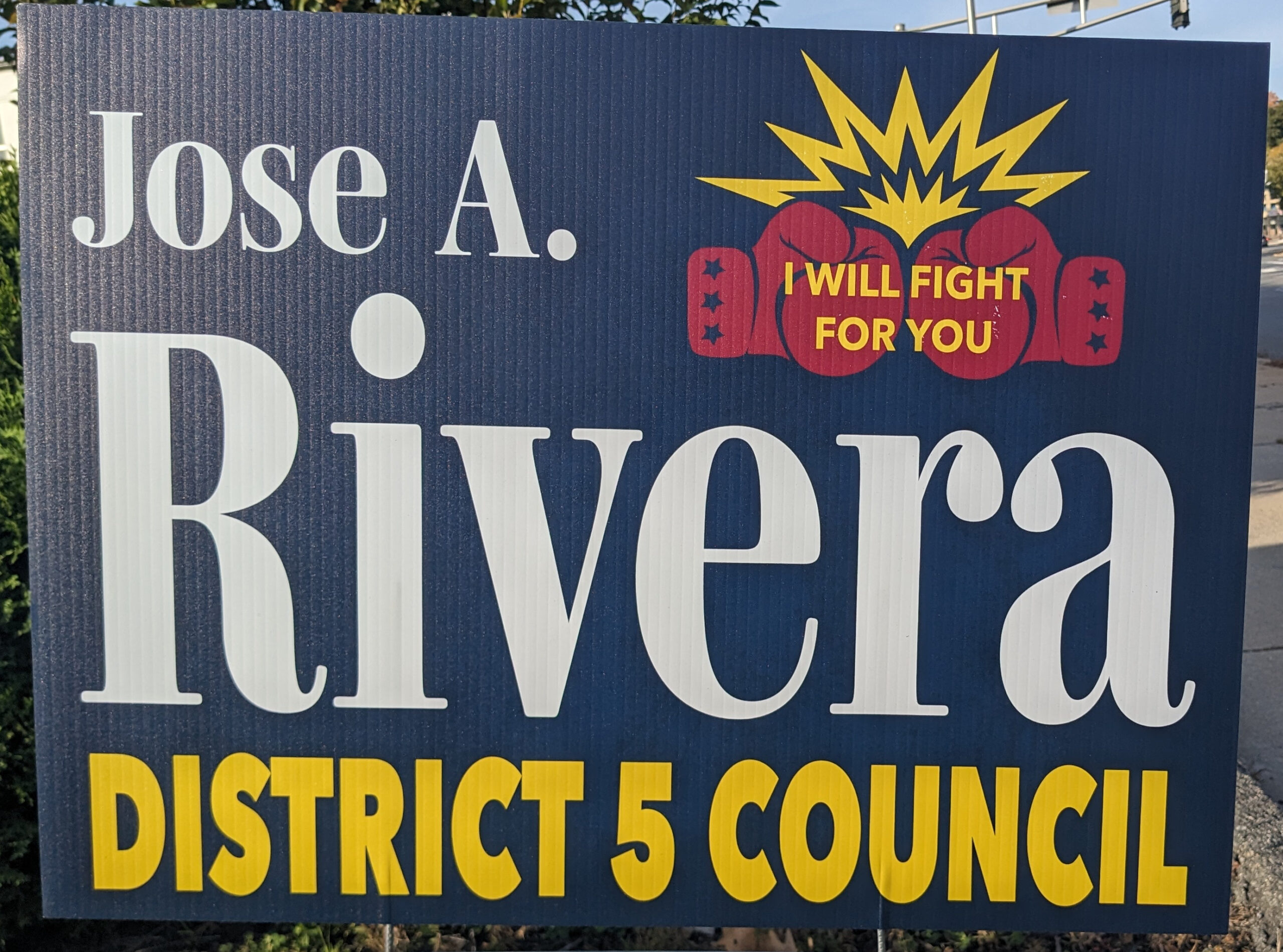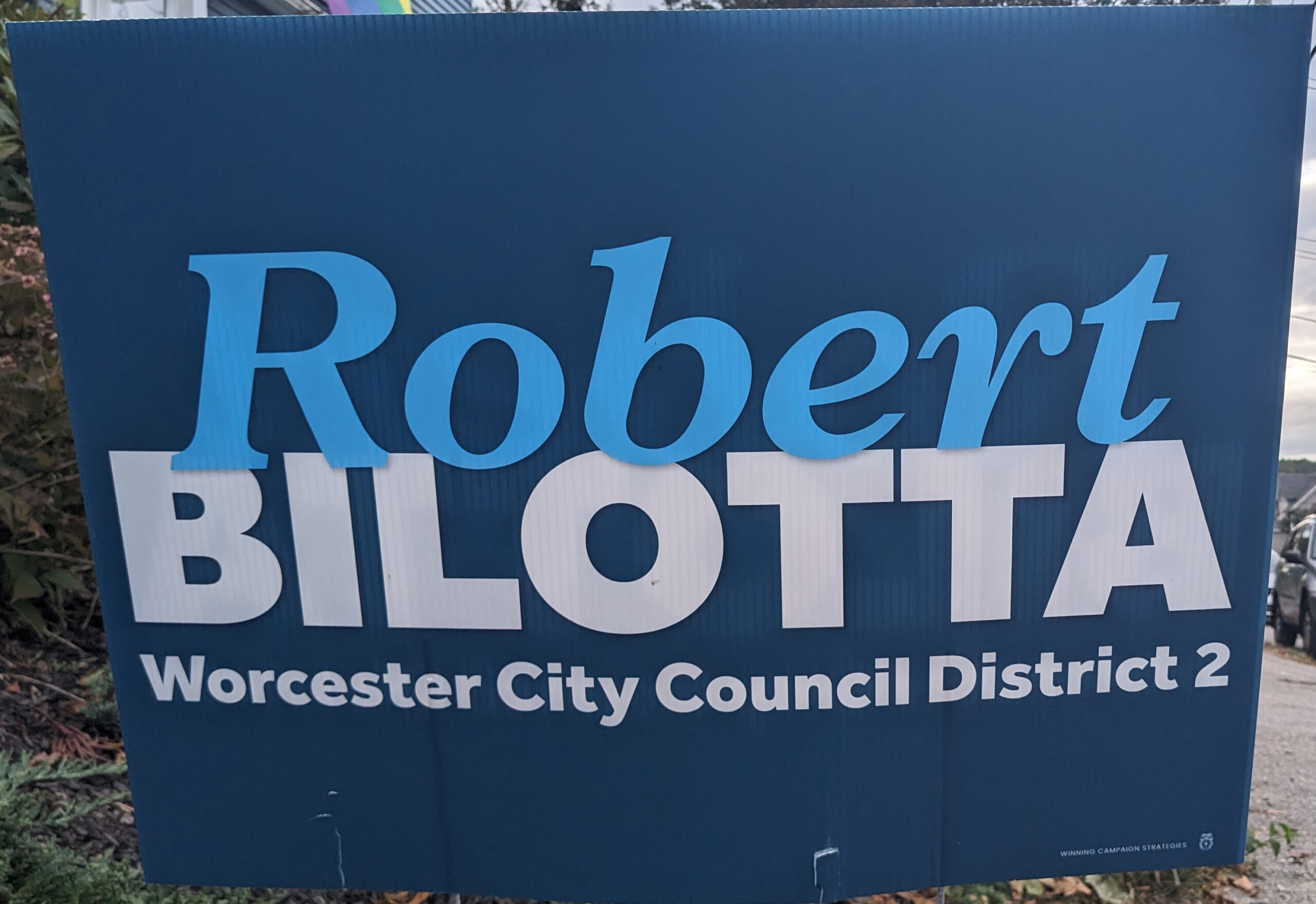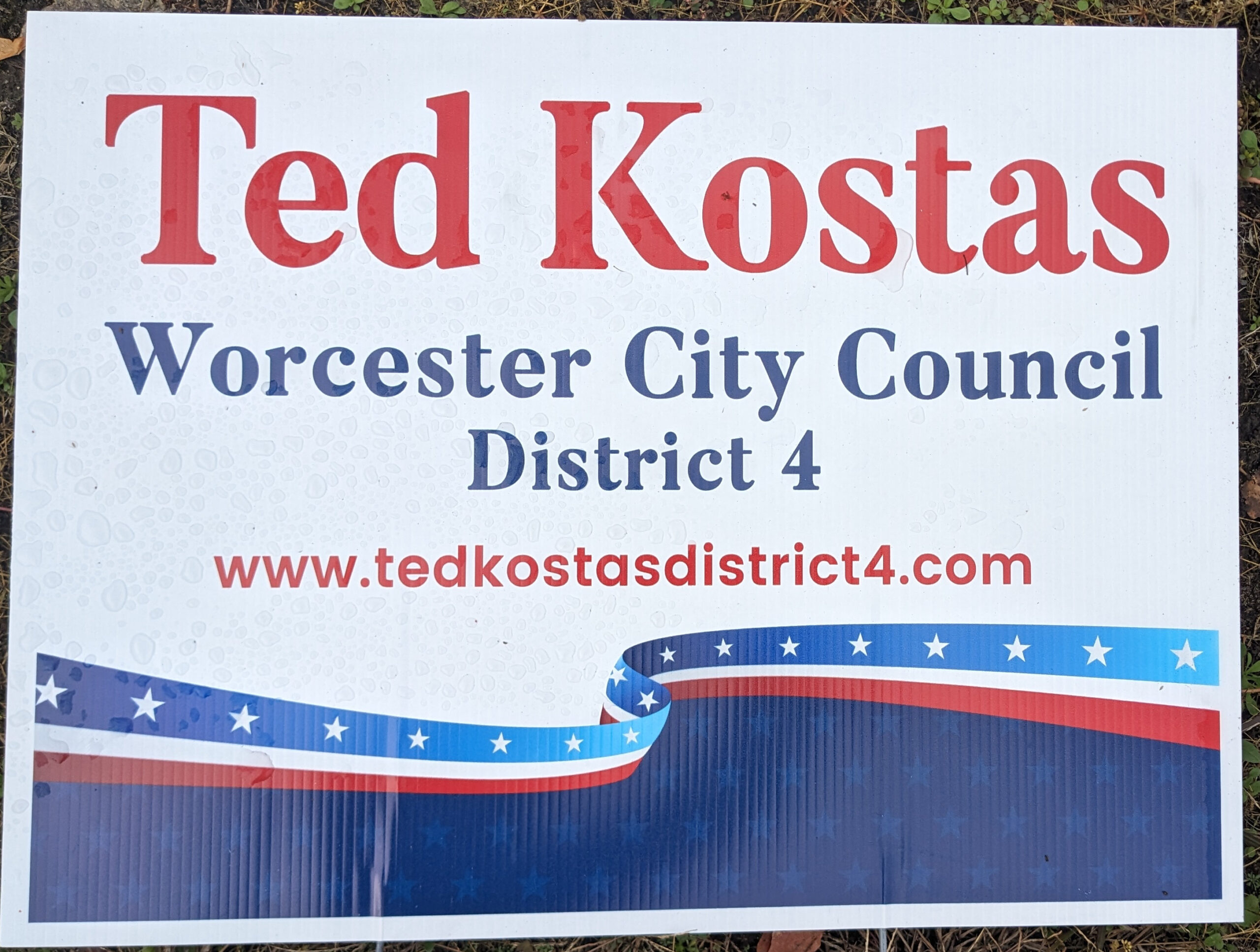 This sign is just great, with distressed type that’s nothing like anything on any other sign, but somehow avoids feeling edgy. Black + white + yellow is a classic color scheme that ignores the whole red vs. blue thing. The word “progress” makes it clear which side of the progressive vs. non-progressive divide he falls on, while “beyond politics” says, “Yes, like you I find the spectacle of the Worcester City Council incredibly annoying.” Great job District 1 for having such great symbolism in your signs, one saying “here’s your Councilor from back in the day using his sign from back in the day,” the other saying “here’s a new guy, with a fresh sign that makes some polarizing (for a Worcester election) choices.”