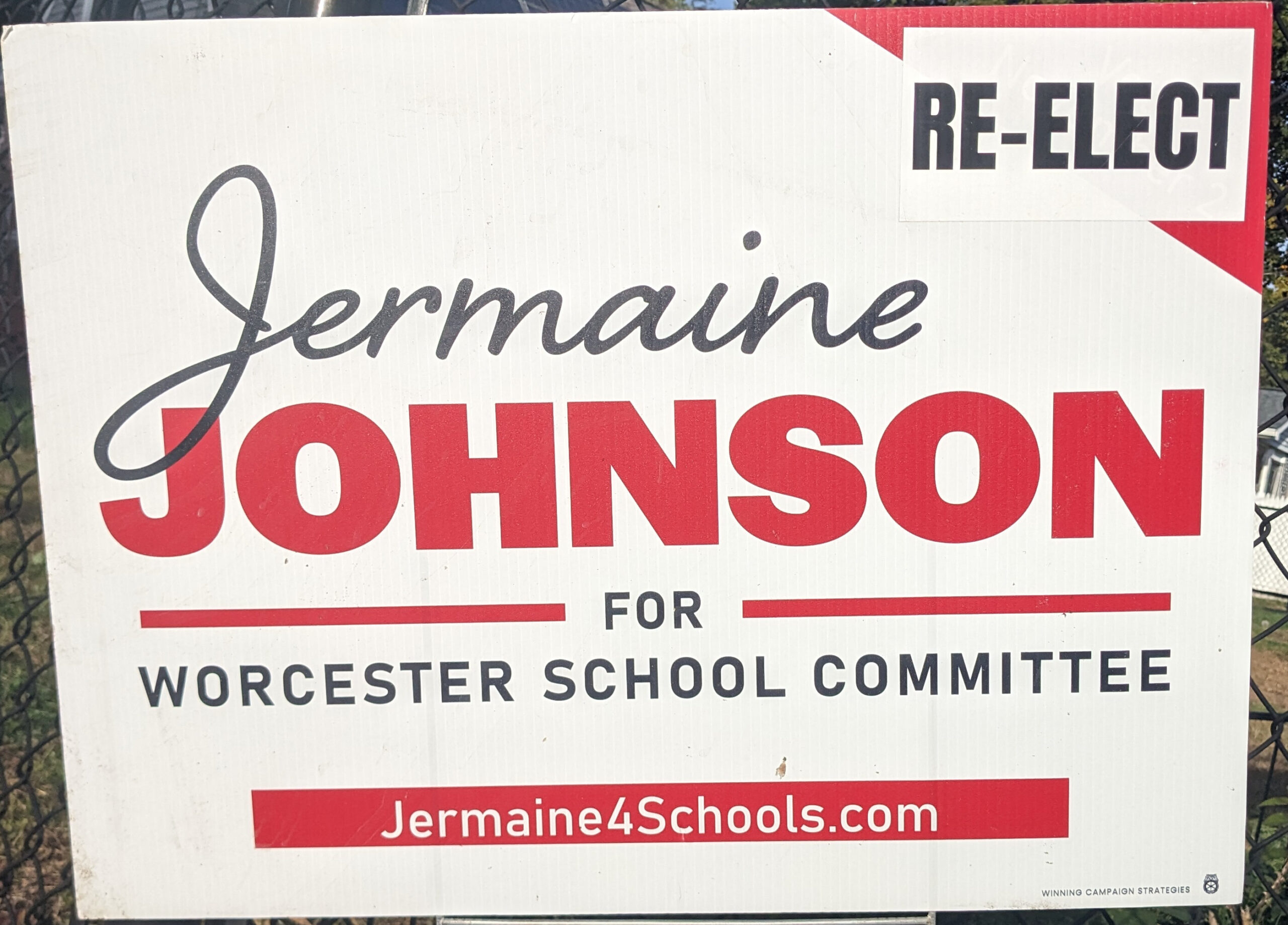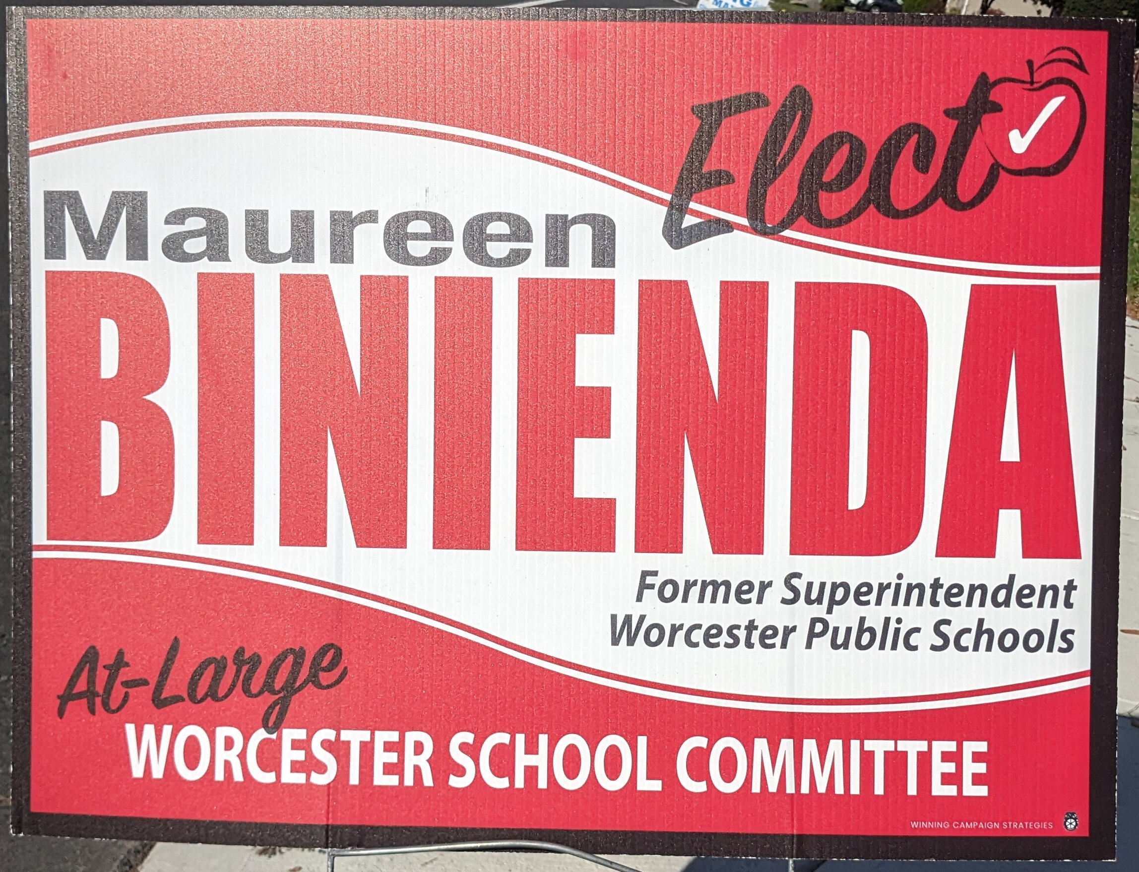 Our third uncontested School Committee race. More of that clean, contemporary graphic design. The red part at the bottom is a visual surprise, especially as the margin above Worcester is so tiny. The rare sign that feels really organized, like “This part is the candidate name, this part is everything else.”
