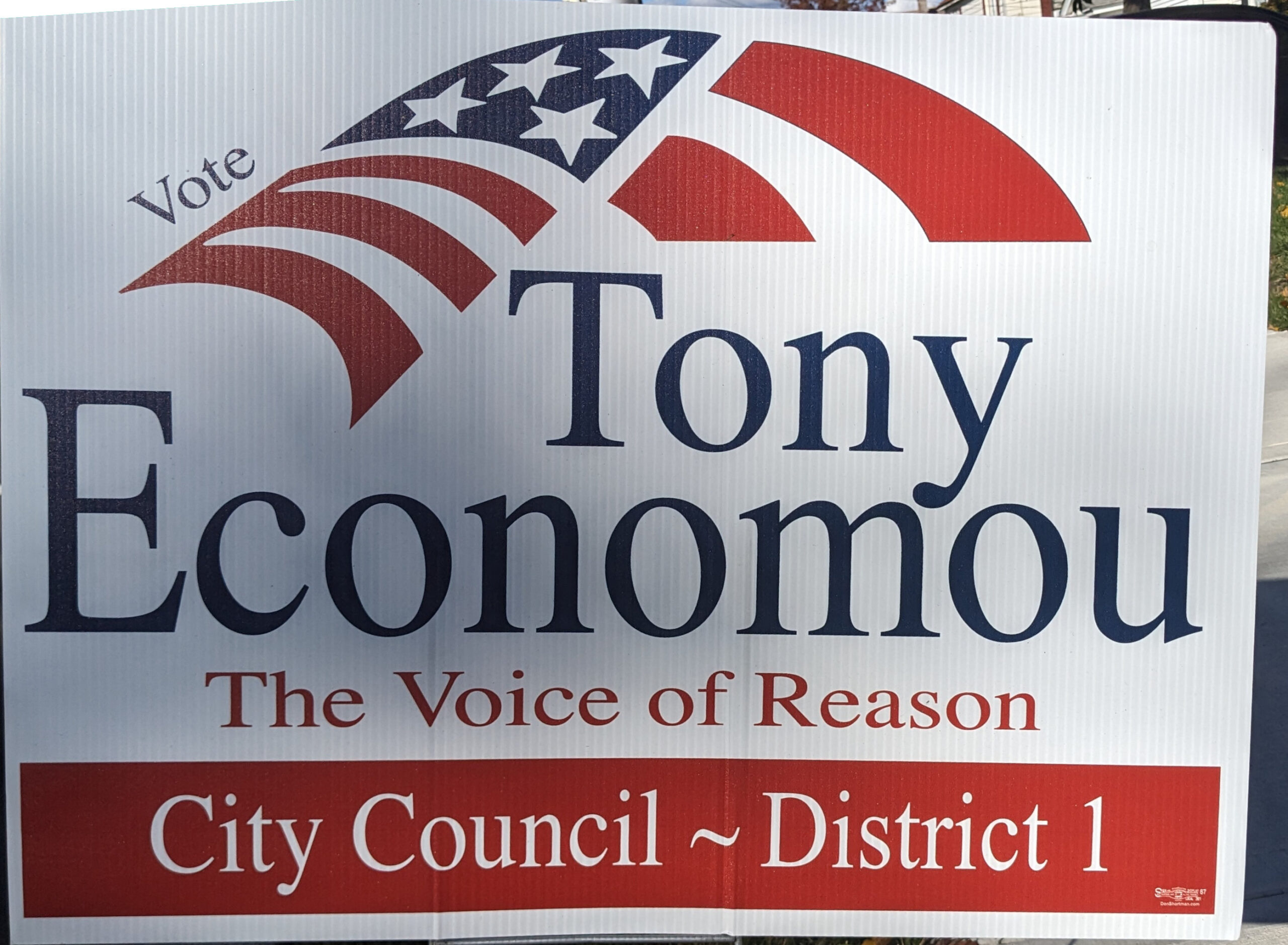 This was never a good sign, and it’s from an era of lawn sign graphic design that has not aged well. The simplified flag is just not good. Is he taking shelter under it? Is his name blocking it from being fully unfurled? Neither of these is a good implication. Maybe clean up the stripes at left so they are not joined on one edge, and run the stripes at right all the way to the blue field. Get rid of the little “Vote” for sure. Don’t make “The Voice of Reason” so short and wide compared to the “City Council ~ District 1” right below it.