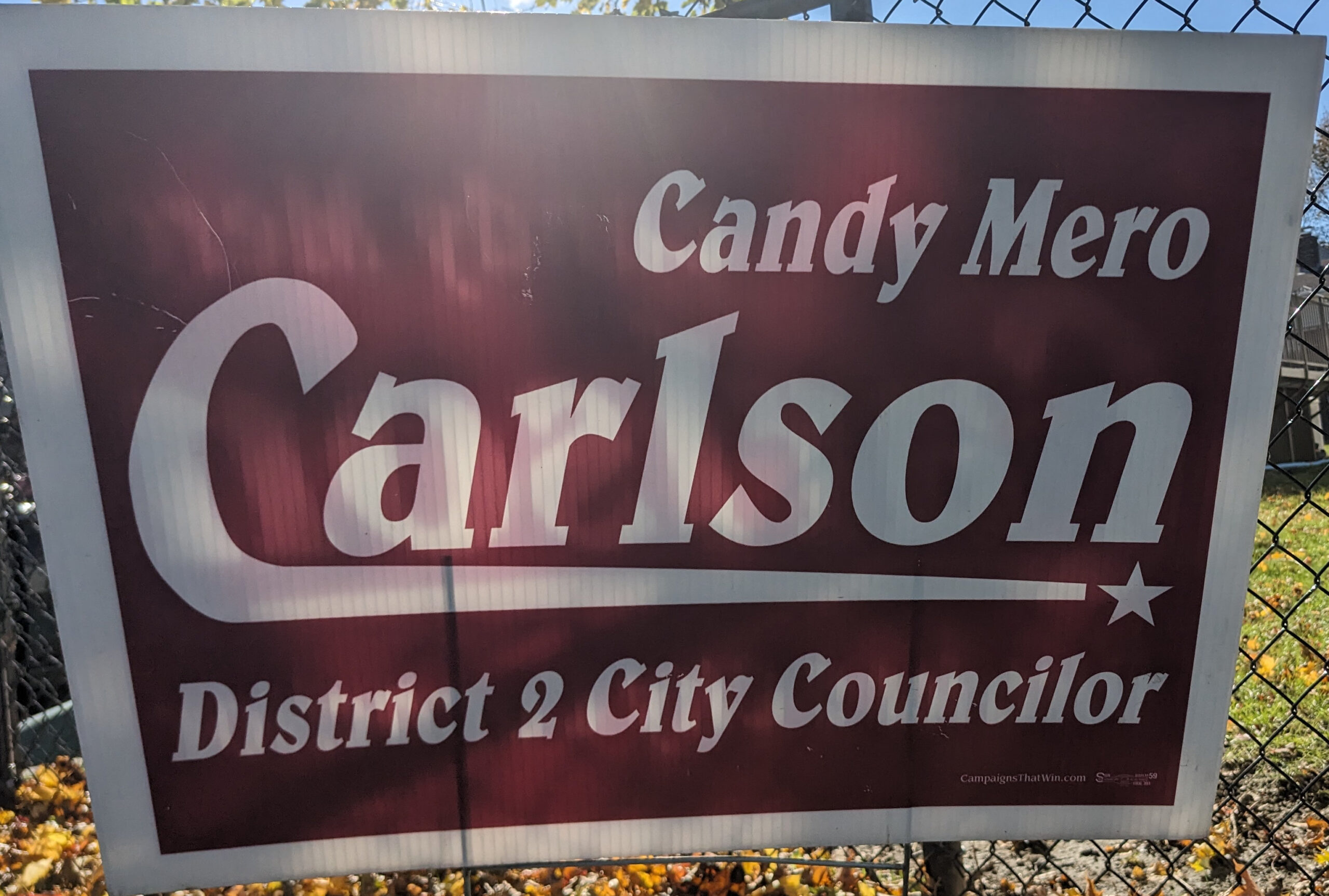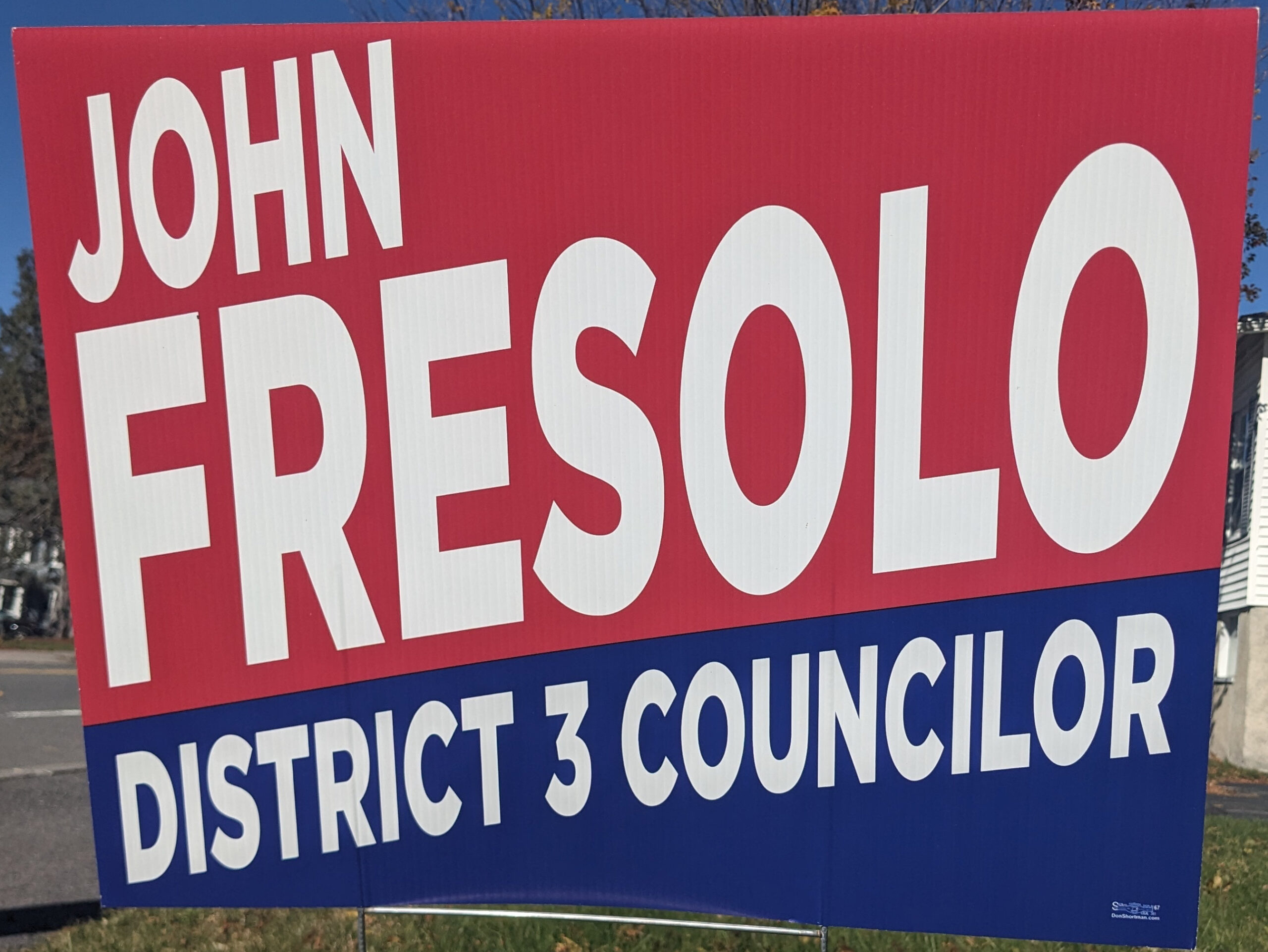 Lawn sign 101. Red + white + blue. Large last name. All the other words as large/readable as possible. Give it some energy by putting everything at an angle. This sign doesn’t want to tell you anything about Fresolo, maybe because it’s confident you remember him from his State Rep days, when his district largely overlapped District 3.