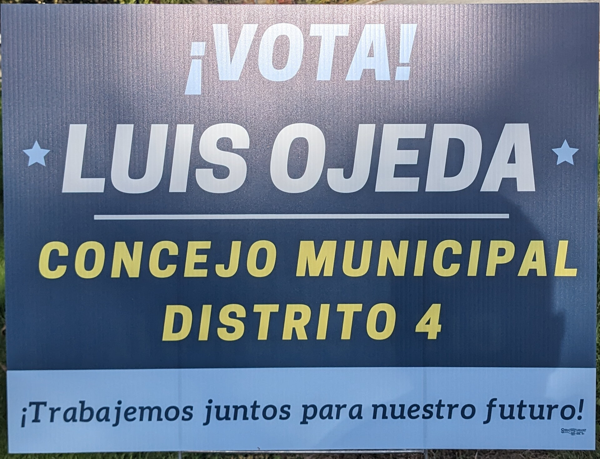 I think this is a pretty effective bilingual sign—any English speaker is going to be able to guess what many of those Spanish words mean. Without making his name too much larger than the other text, he draws extra attention to it with an underline and some stars. The yellow doesn’t pop, but there’s already a lot going on here, subtle colors are a good idea. I appreciate putting “Vote!” in light blue to mute it a bit.