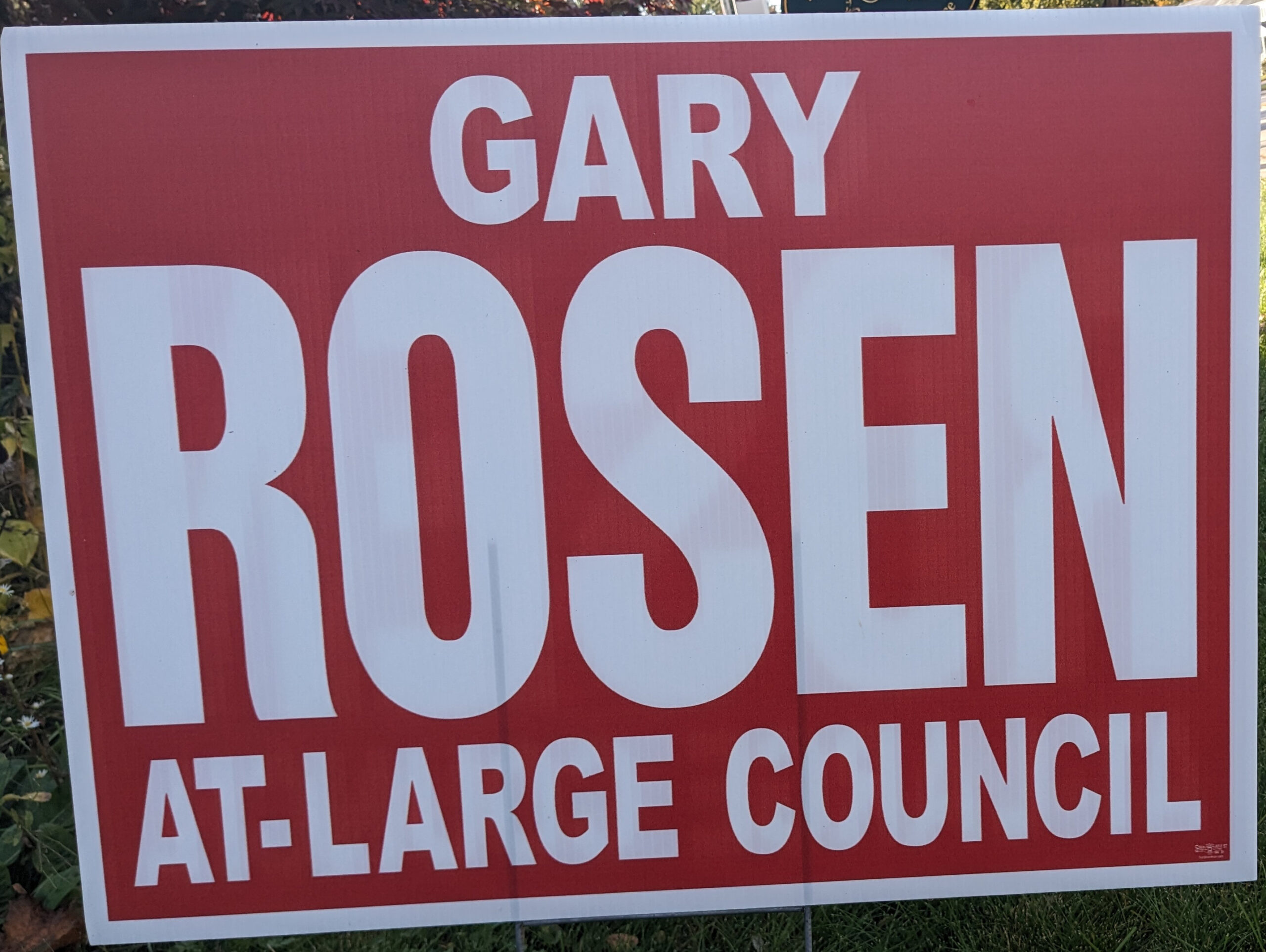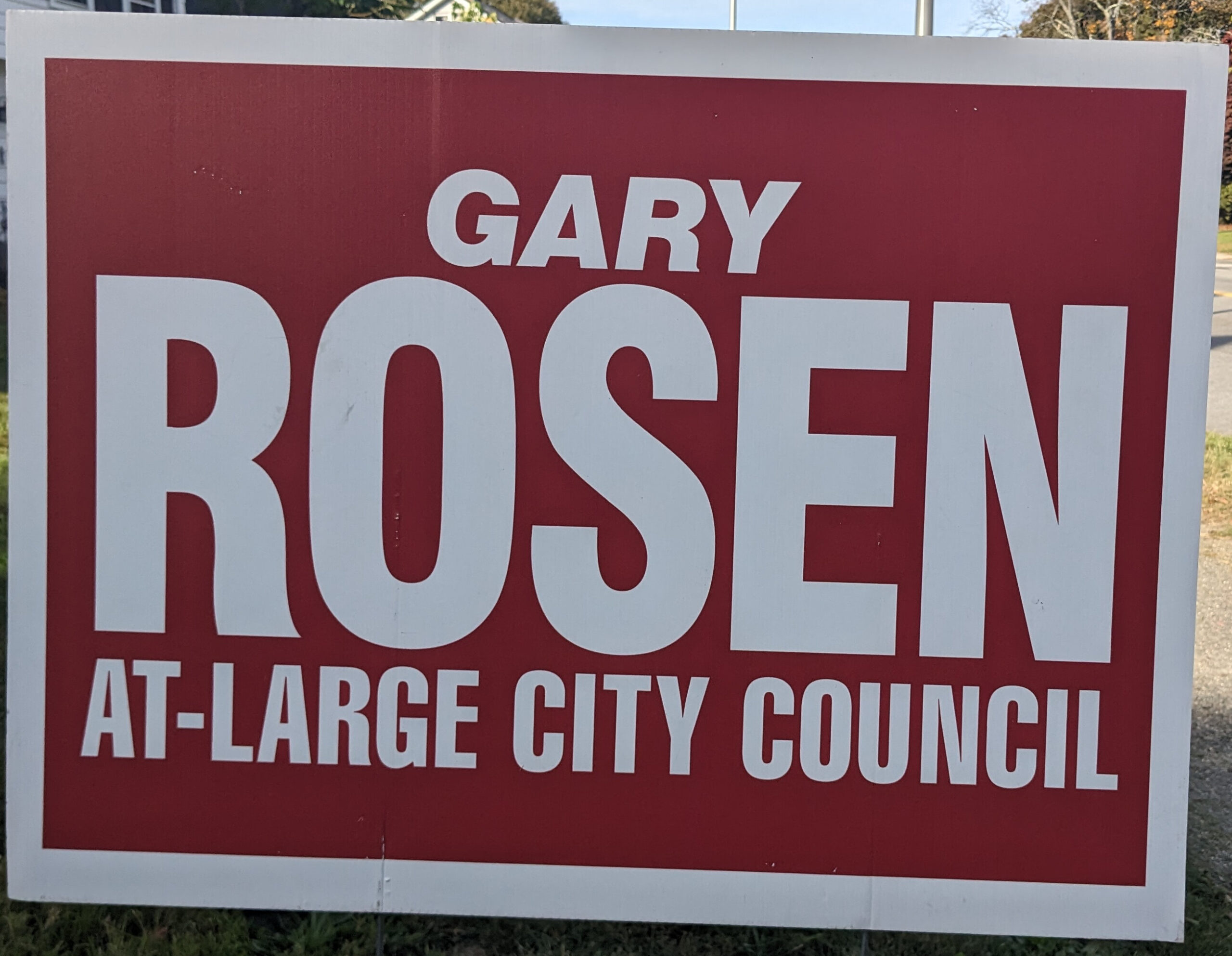 Rosen, rose, the color red. Very simple and with some rough edges, a sign from a previous era, not quite cool enough to be retro, but in no way tacky. Some of the newer signs say “Gary” at the top in italics, some not. I think I saw one that said “Vote” at the top, but I don’t have any pictures of it. Long-time Worcesterites are going to see this sign and just think Rosen, but I wonder if younger voters are going to assume there is some MAGA connection.