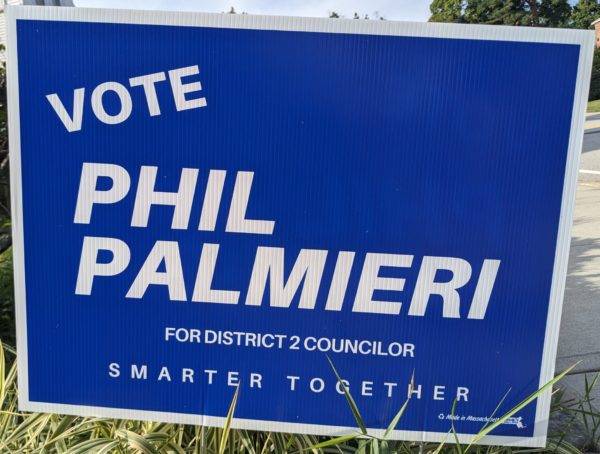 Phil’s been running for office for a long time, so there are lots of signs out there from his previous campaigns. This “Smarter Together” sign is one I haven’t seen before. It’s hardly a disaster, but I find it very distracting, because I’d make changes to every single element. Make “Vote” smaller, italicized, and reposition it so it looks like it was placed with intention. Unitalicize the candidate’s name. Loosen the kerning on “For District 2 Councilor.” Remove the spacing between letters in the slogan, or maybe just get rid of it. No stars.