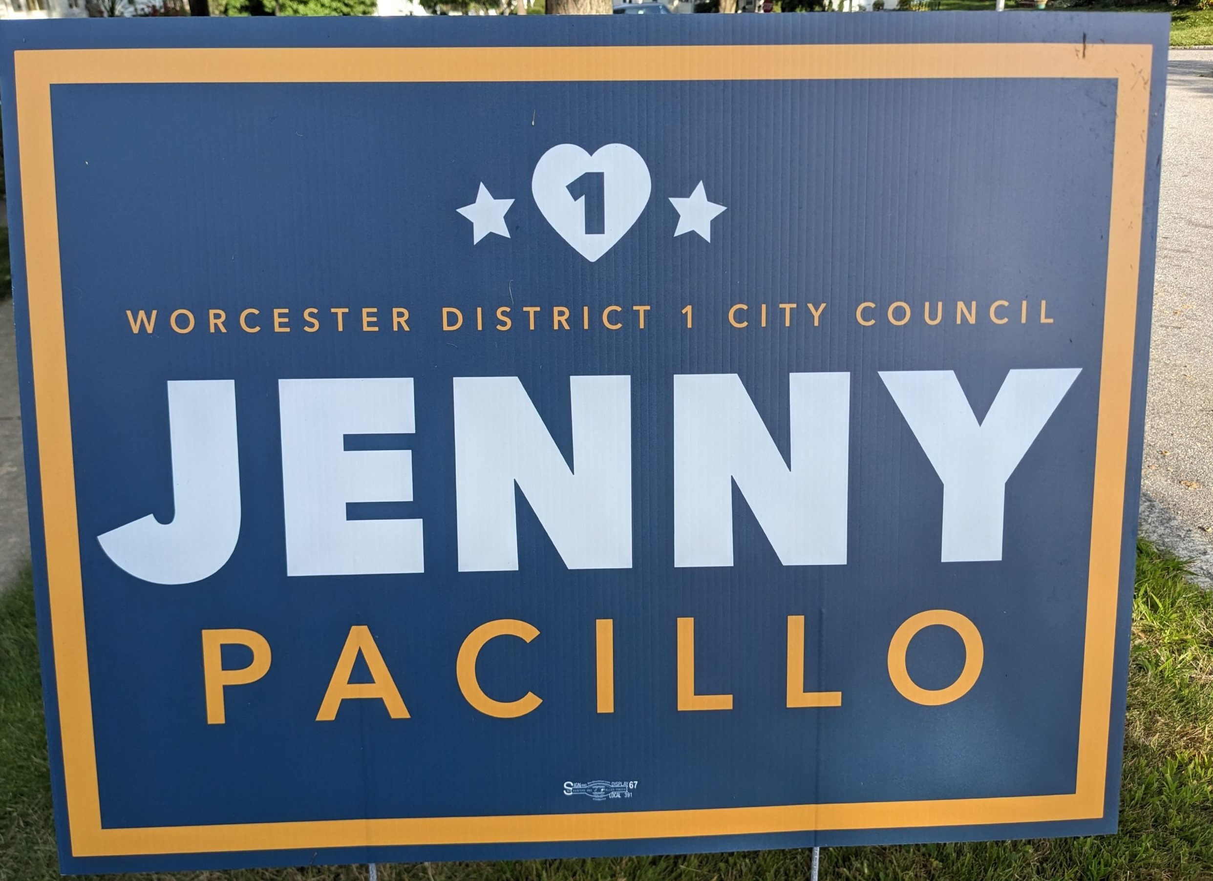 Without making his name too much larger than the other text, he draws extra attention to it with an underline and some stars. The yellow doesn’t pop like the orange on Jenny Pacillo’s sign, but there’s already a lot going on here, subtle colors are a good idea. I appreciate putting “Vote!” in light blue to mute it a bit. Two stars.